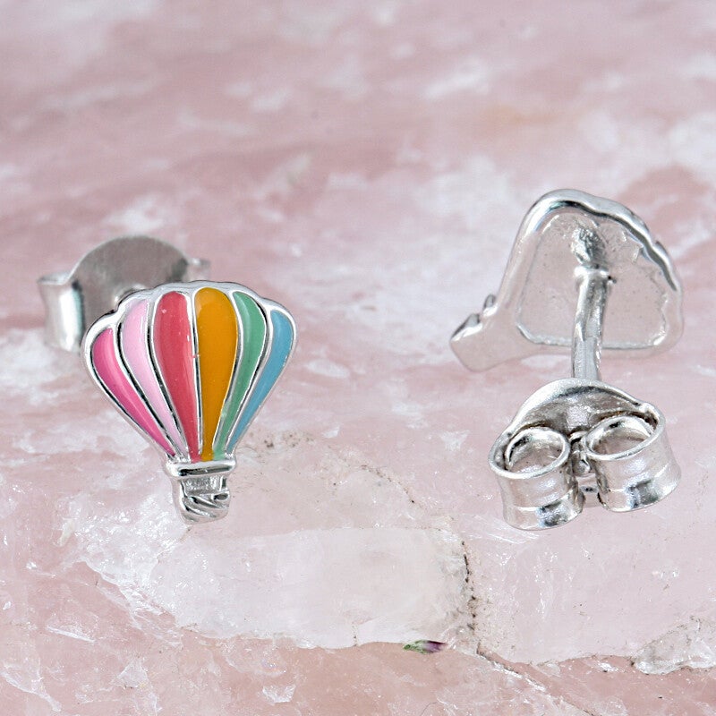 Zilveren luchtballon oorknoppen met 6 vrolijke emaille kleuren.