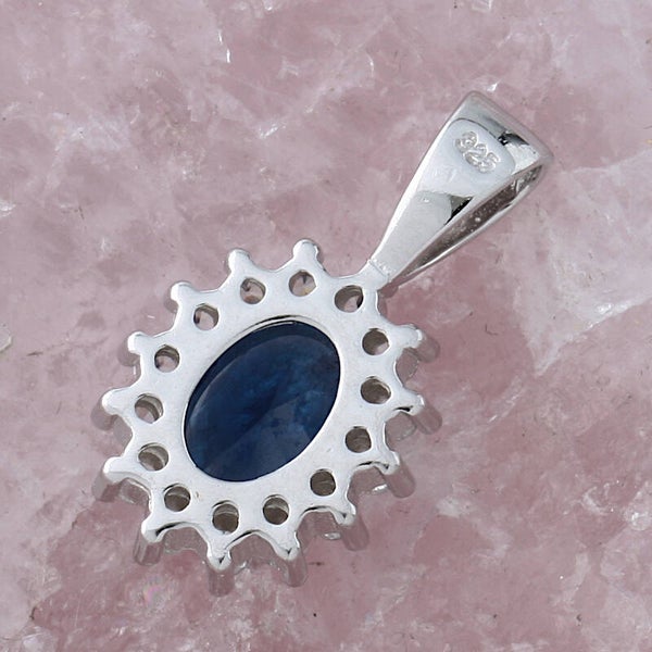 Dit bijzonder mooie hangertje van een synthetische blauwe saffier heeft een rand met witte zirkonia steentjes, die het een extra schitterende glans geven.