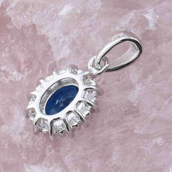 Deze prachtige synthetische blauwe saffier is facet geslepen en heeft een randje van kleine zirkoniasteentjes die het extra laten glinsteren.