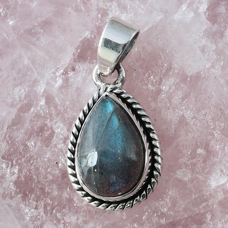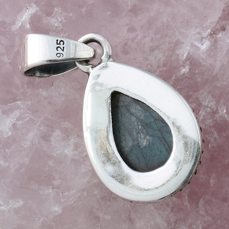 Deze druppelvormige labradoriet hanger heeft een stevige rand van gedonkerd zilver pareldraad voor een mooie diepe glans. Labradoriet is een edelsteen met veel tinten groen en heeft een beschermende en helende werking.