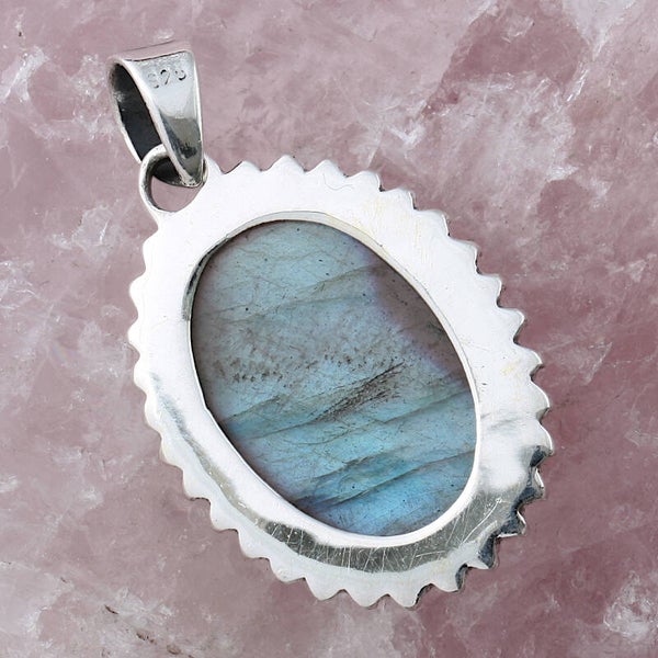 Deze ovalen labradoriet hanger is stevig gezet in een gedonkerd zilveren sierlijke rand, wat hem een rijke uitstraling geeft. Labradoriet is een edelsteen met veel tinten groen en heeft een beschermende en helende werking.